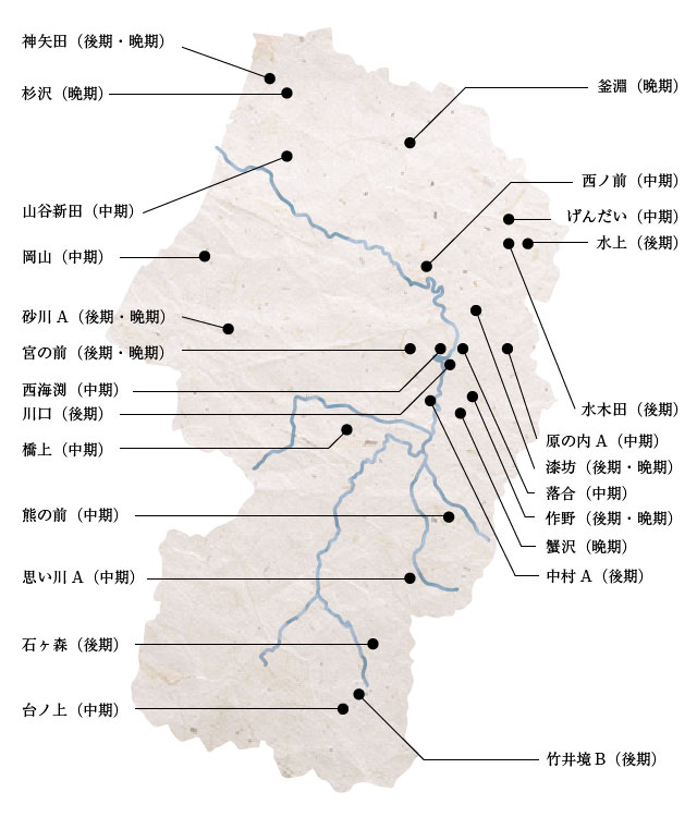 山形県最上郡舟形町を東西に流れる最上小国川(通称:小国川)流域には河岸段丘が形成され多くの遺跡が確認されています。