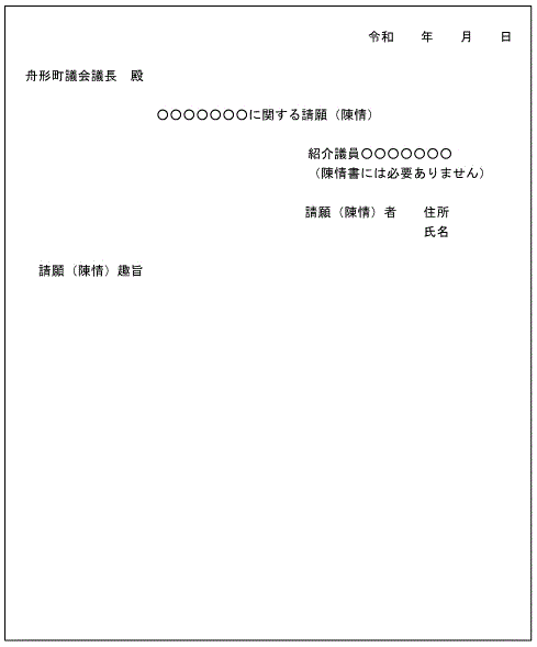 更新日:2022年9月1日 LINEで送る シェア ツイート 国や県、町などに対して意思を表明する手段の一つとして、「請願」、「陳情」があります。 受理した請願書、陳情書は、議長決裁の後、議会運営委員会に諮られます。 請願書には内容に賛意を表する紹介議員(1名以上)が必要です。(陳情には必要ありません。) 提出された請願(陳情)書は、議会運営委員会に諮られ、該当する常任委員会に付託され審査された後、本会議で採択・不採択のいずれかが決定します。 PDF・Word・Excelなどのファイルを閲覧するには、ソフトウェアが必要な場合があります。詳細は「ファイルの閲覧方法」を確認してください。 ファイルの閲覧方法 このページに関する問い合わせ先 議会事務局電話番号:0233-32-0030 メールで問い合わせ このページに関するアンケート